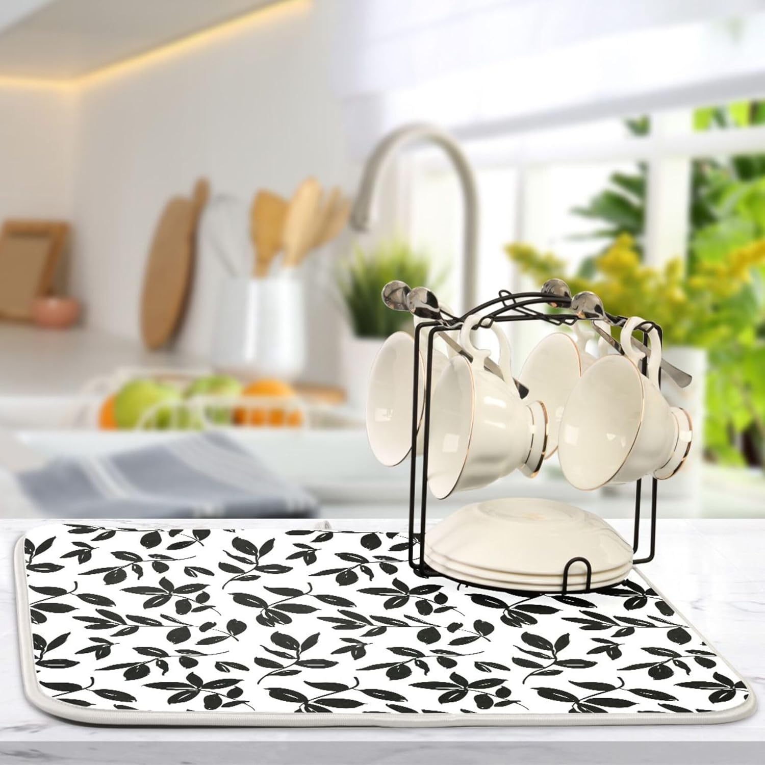 Eucalyptus Leaves Dish Drying Mat for Kitchen Countertop 16x18 Black White Floral Leaf Small Drying Mat Reusable Quick Dry Dish Sink Absorbent Mats Dishwasher Easy Clean Decorative Home Essentials