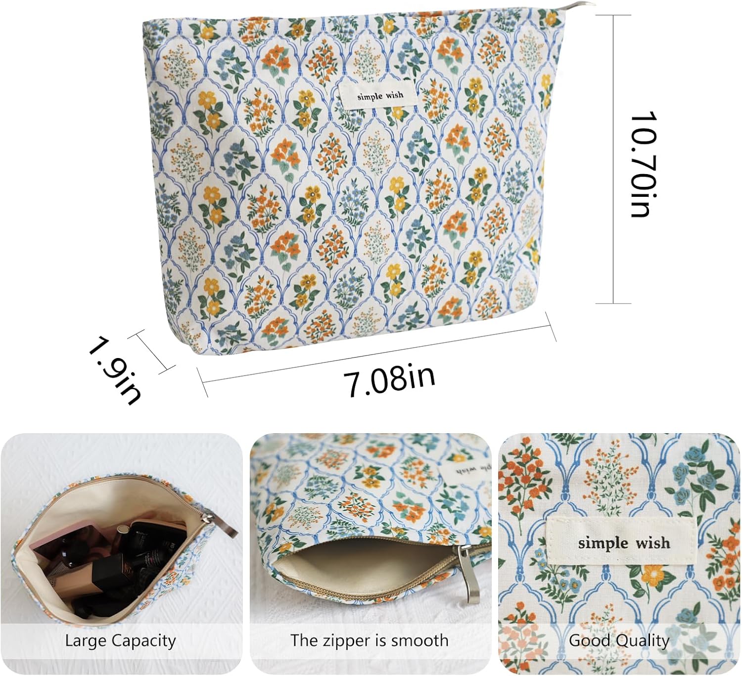 Wudygirl Cute Makeup Bag for Women - Travel Cosmetic Bag with Zipper Makeup Pouch Floral Make up Organizer Handbag Aesthetic (Blue Striped Floral)