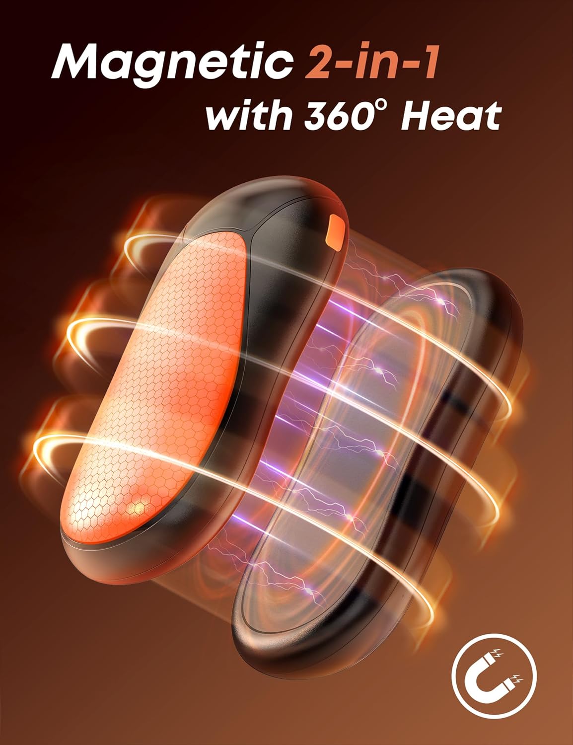 - [2-in-1 Magnetic Design] Use two heated hand warmers separately, one for each hand, or snap them together magnetically for a 360° surround heating experience. This versatile design adapts to your needs—easy to carry in pockets, perfect for skiing, hunting, golfing, football, baseball, or sharing warmth with family and friends.
