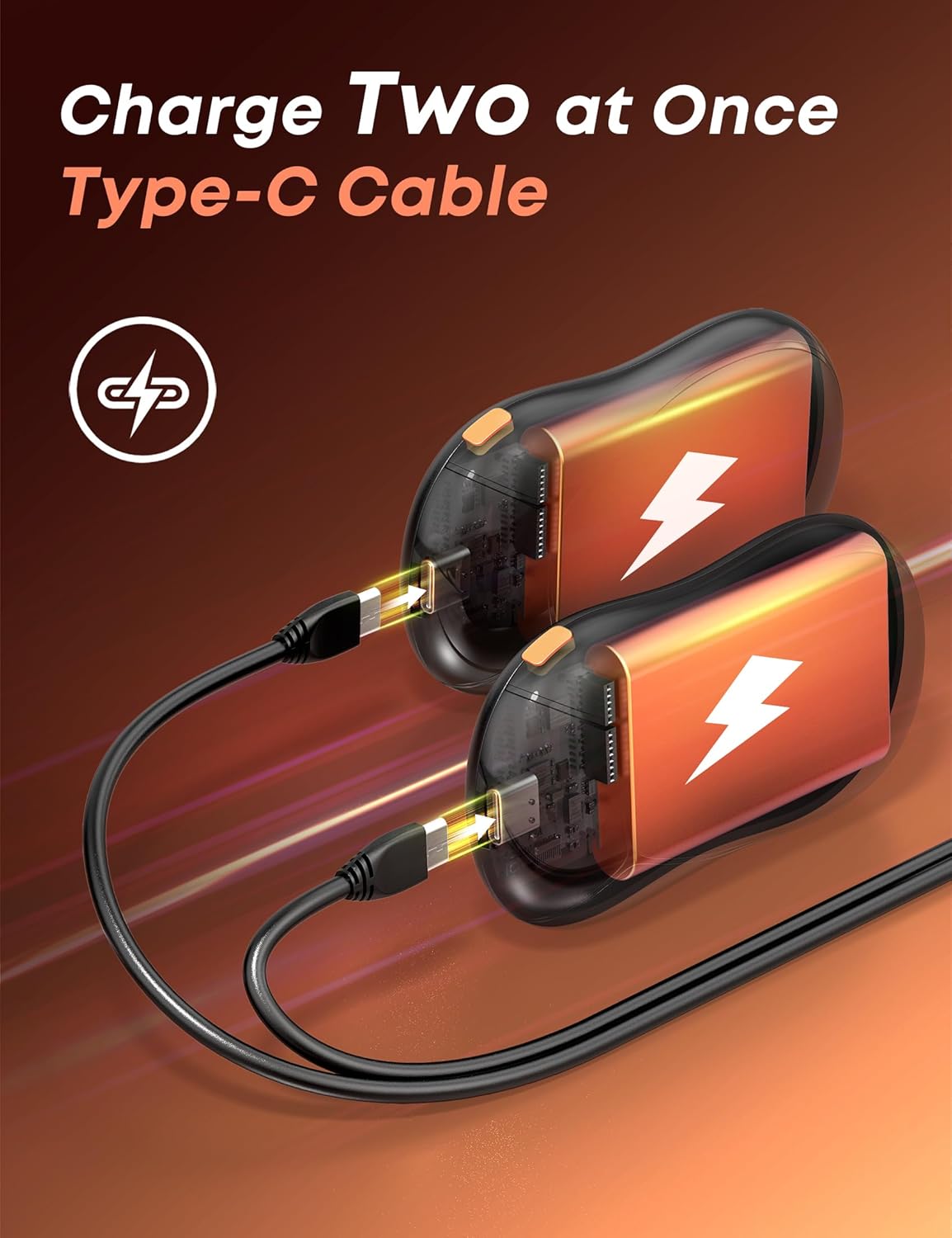 - [Smart Dual Charging & Safe Design] The set comes with a USB cable featuring dual Type-C connectors, allowing both units to charge simultaneously. Each reusable hand warmer is built with 20× advanced safety protections, ensuring safe and reliable warmth anytime. Compact and easy to carry, perfect for outdoor activities, sports, or daily winter use.
