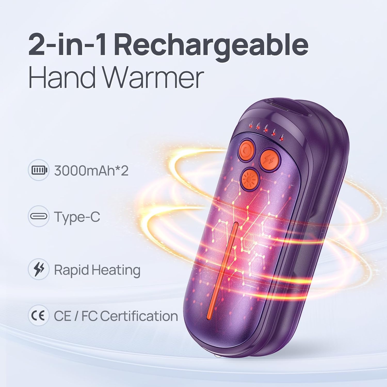 - 【Rechargeable Hand Warmer】: 2-in-1 Hand Warmers Rechargeable, 6000mAh Battery Capacity Offers Superior Comfort and Durability. For Winter Camping Essentials. Our Electric Hand Warmers Have Passed UL/CE, and FCC etc Safety Certifications