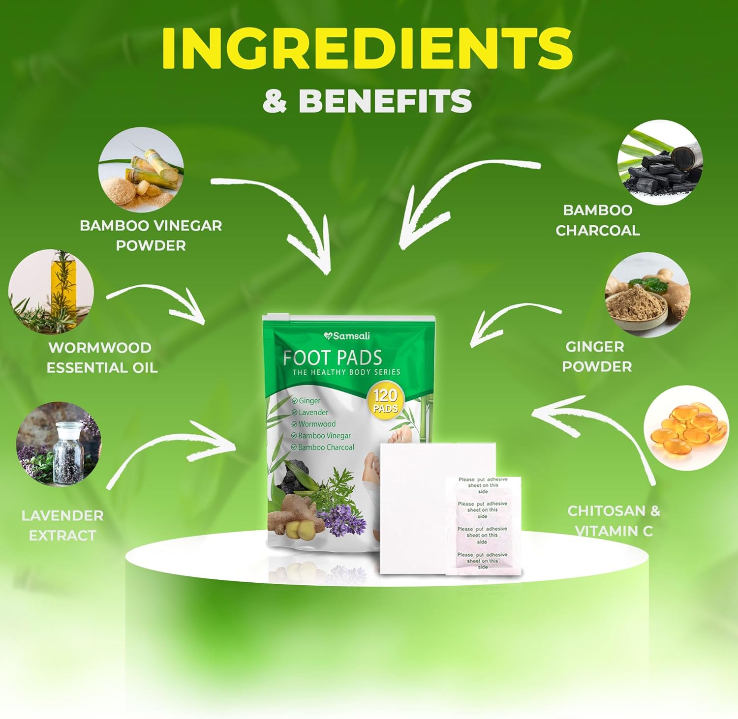 Samsali Ginger Foot Pads for Pain Relief: 120-Pack Natural Bamboo Vinegar Bamboo Charcoal Wormwood Lavender Ingredients Foot Patches - Comfort for Stress Relief - Ideal for Adults Elderly Sleep