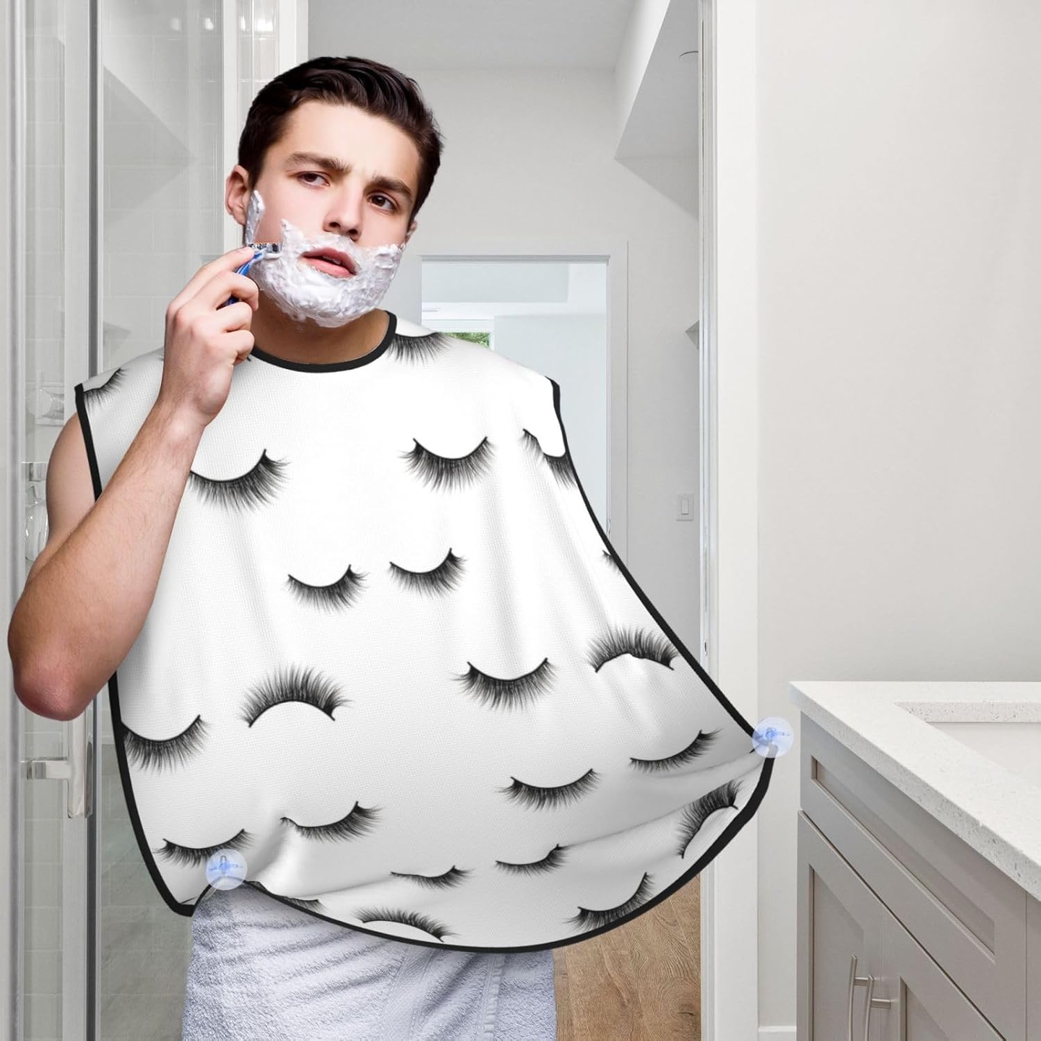 Strong Suction Cup Beard Grooming Bib, Non-Stick Hair Catcher, Waterproof, for Shaving, Black Eyelash White