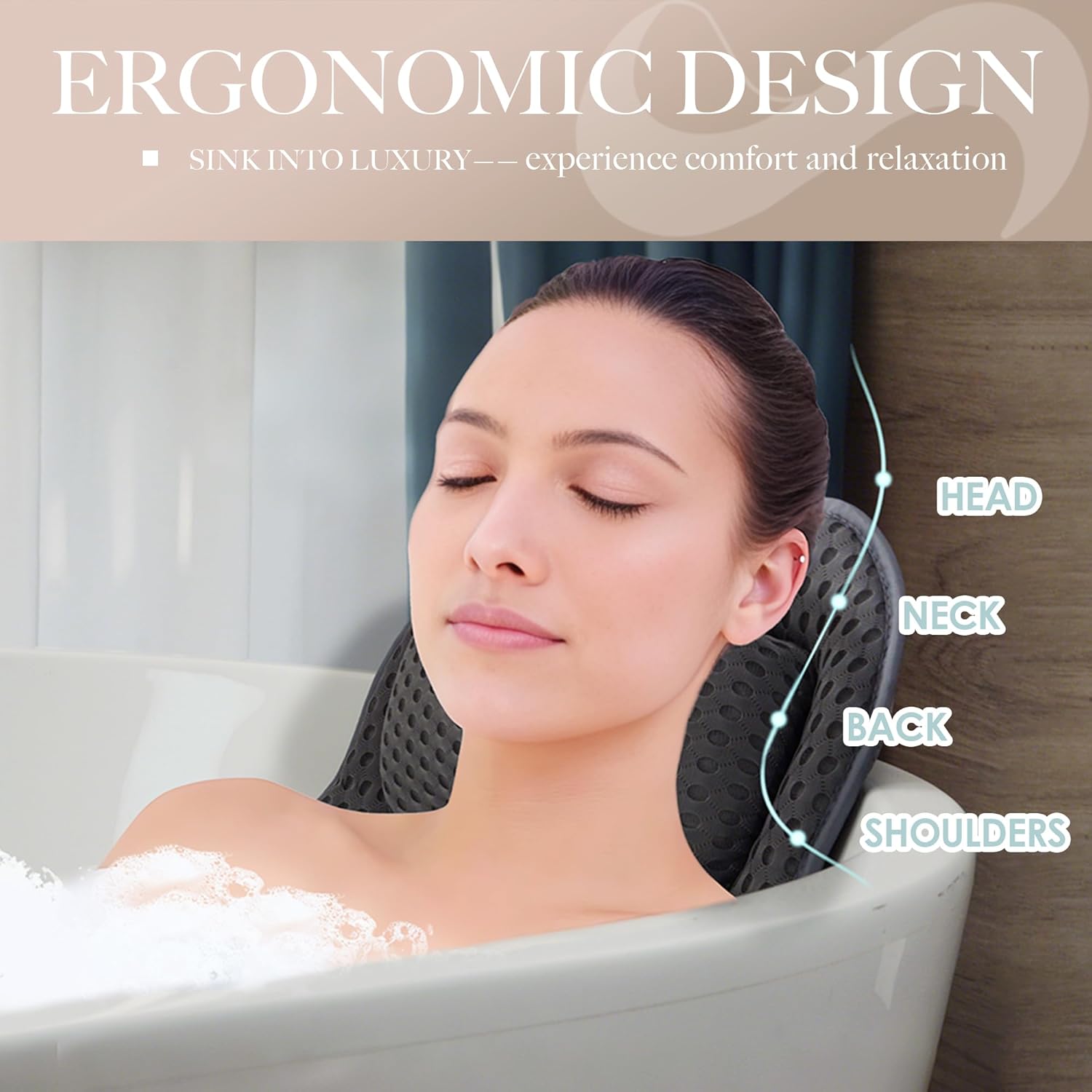 Bath Pillow for Tub, 4D Air Mesh Breathable Fabric, Soft Supportive Bathtub Cushion for Head Neck Back, Ergonomic Spa Pillow with Strong Suction Cups, Quick-Drying, Machine Washable (Black)