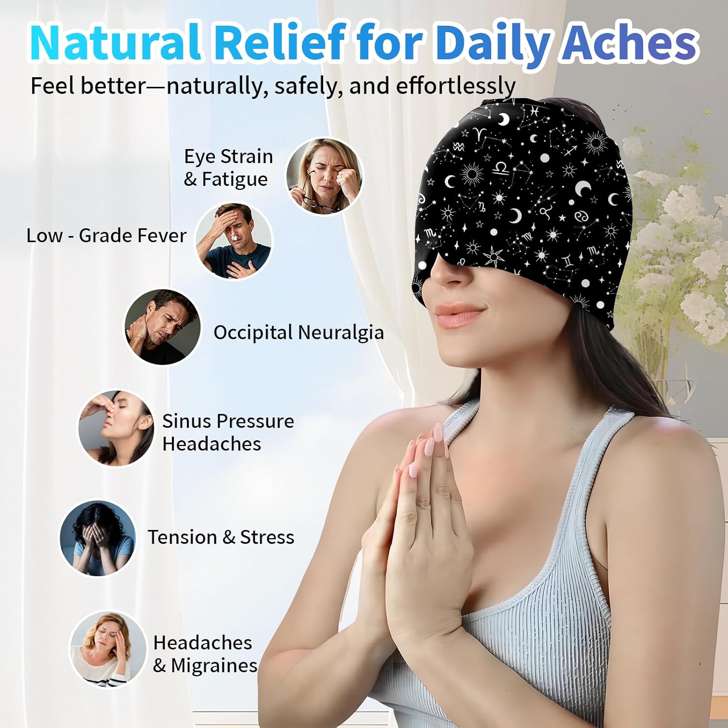 Migraine Relief Cap,Headache Relieve Cap,Black Constellation Pattern Reusable Gel Ice Head Wrap Cap for Tension,Stress,Hangover & Puffy Eyes.