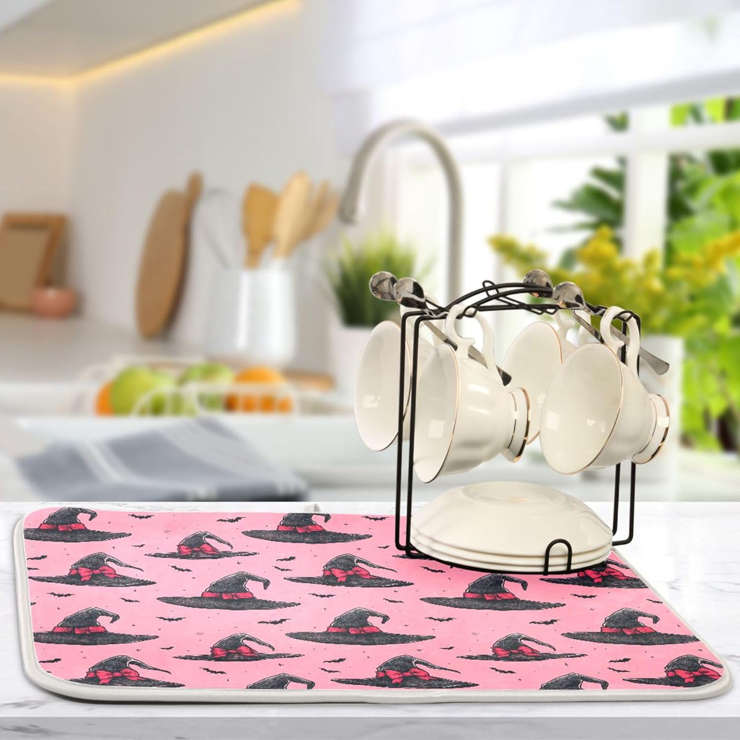 Witch Bow Hot Pink Dish Drying Mat for Kitchen Countertop 16x18 Halloween Bowknot Bat Small Drying Mat Reusable Quick Dry Dish Sink Mats Easy Clean Decorative Essentials
